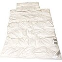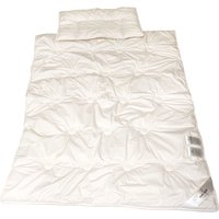 Schlafset für Babys und Kinder bestehend aus Bettbedecke und Flachkissen Unser Schlafset aus Merino-Schafschurwolle (kbT) besteht aus einer Ganzjahresdecke aus Merino-Schafschurwolle und einem Flachkissen aus Baumwolle (kbA). Sowohl die Bettdecke als auch das Flachkissen sind umhüllt mit einem Inlett aus reiner Bio-Baumwolle (kbA). Sie erhalten dieses wunderbare Schlafset für Kinder (Decke 100x135cm, Kissen 40x60cm), das die besten Eigenschaften zweier Naturfasern vereint und für ein optimales Schlafklima sorgt, das Ihre Schützlinge zum Träumen einlädt. Hergestellt in Deutschland. Ganzjahres Bettdecke aus Merino-Schafschurwolle (kbT) 100x135cm Flachkissen aus Bio-Baumwolle (kbA) 40x60cm Optimal für Babys und Kleinkinder Für ein besonders angenehmes Schlafklima Hergestellt in Deutschland Kuschelige Ganzjahres-Bettdecke aus Merinowolle Unsere wunderbar kuschelige und anschmiegsame Baby- und Kinderbettdecke aus feinst gekräuselter Merino-Schafschurwolle (kbT) sorgt für ein ganz besonders angenehmes Schlafklima für Ihre Liebsten. Kinderbettdecken aus der Schurwolle der Merinoschafe sind besonders feuchtigkeitsregulierend und hervorragend klimatisierend. Schurwolle ist bakterienabweisen und verfügt über hohe Selbstreinigungskräfte wenn sie, wie bei uns, naturbelassen verarbeitet wird. Bettdecken für Babys und Kinder aus Merino-Schafschurwolle gelten als besonders strapazierfähig und sind bei Eltern sowie bei Ihrem Nachwuchs sehr beliebt. Wunderbares Flachkissen aus Bio-Baumwolle (kbA) Das in unserem Baby- und Kinderschlafset enthaltene Flachkissen lassen wir aus bester Bio-Baumwolle aus kontrolliert biologischem Anbau fertigen. Unsere Kopfkissen für Säuglinge und Kleinkinder sind flach gearbeitet und mit reiner Bio-Baumwolle gefüllt. Im Liegebereich des kleinen Köpfchens befinden sich keine Steppnähte, so dass ein optimaler Schlafkomfort gegeben ist. Der Randbereich dieses schönen Flachkissens ist leicht erhöht. Baumwolle ist atmungsaktiv und feuchtigkeitsausgleichend zugleich und gilt als besonders hautsympathisch. Sie können dieses wunderbare Flachkissen aus reiner Bio-Baumwolle bis 60°C im Schonwaschgang Ihrer Maschine reinigen. Details zum Schlafset 2-teiliges Schlafset aus Bettdecke und Flachkissen Aus reinen Naturfasern in bester Bio-Qualität Bettdecke besonders feuchtigkeitsregulierend und klimatisierend Schurwolle verfügt über hohe Selbstreinigungskräfte Besonders kuschelig und anschmiegsam Flachkissen feuchtigkeitsregulierend, atmungsaktiv und hautsympathisch Inletts aus reiner Bio-Baumwolle (kbA) Für ein hervorragendes, trockenes Schlafklima Wärmeverhalten**** Feuchtigkeitsausgleich**** Wohlfühlfaktor****
