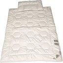 Baby- und Kinderschlafset aus feiner Wildseide Mit unserem Schlafset für Babys und Kinder erhalten Sie eine wunderbar leichte und anschmiegsame Baby- und Kinderbettdecke aus feiner Wildseide. Damit Ihr Kind tief und erholsam schlafen kann, erhalten Sie ein passendes Flachkissen aus bester Bio-Baumwolle (kbA) gleich dazu. Die Inletts von Kopfkissen und Bettdecke bestehen ebenfalls aus reiner Bio-Baumwolle. Wir von Hans Natur bieten Ihnen dieses wunderbare Schlafset in zwei unterschiedlichen Größen an. Hergestellt in Deutschland. Bettdecke aus Wildseide 100 x 135 cm, 450 g Flachkissen aus Bio-Baumwolle (kbA) 40 x 60 cm, 250 g Bestens geeignet für Babys und Kleinkinder Besonders leicht und anschmiegsam Hergestellt in Deutschland Kinderbettdecke aus leichter und anschmiegsamer Wildseide Bettdecken aus Wildseide sorgen insbesondere bei höheren Temperaturen für ein besonders angenehmes Schlafklima. Die Baby- und Kinderbettdecke für Ihre Kleinsten aus feiner Wildseide ist besonders leicht und legt sich sanft wie eine zweite Haut über den zarten Körper Ihres Lieblings. Sie ist besonders feuchtigkeitsregulierend und bekannt für ihre beruhigende Wirkung auf gereizte und empfindliche Haut. Wir empfehlen unsere Bettdecke aus Wildseide für Kinder mit einem geringen Wärmebedürfnis oder hoher eigener Körperwärme. Ebenso ist die leichte Kinderbettdecke für das Schlafen im warmen Zimmer geeignet. Im Gegensatz zur Zuchtseide beziehen wir unsere Wildseide erst dann, wenn der Schmetterling seinen Kokon bereits verlassen hat. Dies sorgt dafür, dass die Schmetterlingsraupe nicht getötet werden muss. Wunderbares Flachkissen aus reiner Bio-Baumwolle (kbA) Zu der wunderbaren Kinderbettdecke aus Wildseide erhalten Sie ein Flachkissen, dass besonders an die speziellen Bedürfnisse von Babys und Kinder ausgelegt ist. Das flach gehaltene Kopfkissen mit der Füllung aus reiner Bio-Baumwolle sorgt für eine angenehme Lagerung des empfindlichen Köpfchens. Der Randbereich dieses Flachkissens ist leicht erhöht. Im Liebebereich des Köpfchens befinden sich keine Steppnähte, die den Schlaf Ihres Kindes stören könnten. Der Kopfkissenbezug besteht ebenfalls aus reiner Bio-Baumwolle, die wir selbstverständlich aus biologischem Anbau beziehen. Sie können das flache Kinderkissen bis 60 °C im Schonwaschgang Ihrer Waschmaschine reinigen. Bitte achten Sie im Anschluss darauf, dass Kissen lediglich leicht zu schleudern, in Form zu ziehen und anschließend liegend zu trocknen. Details zum Schlafset 2-teiliges Schlafset bestehend aus Bettdecke und Kopfkissen In 2 Größen erhältlich Bettdecke: Füllung Wildseide, Inlett Bio-Baumwolle (kbA) Besonders leicht und anschmiegsam Angenehmes Schlafklima auch an wärmeren Tagen Für Kinder mit geringem Wärmebedürfnis Flachkissen: Füllung und Inlett ausBio-Baumwolle (kbA) Wärmeverhalten** Feuchtigkeitsausgleich*** Wohlfühlfaktor****