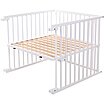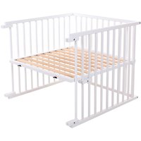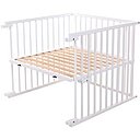 Umbausatz für das Babybay Original zum Kinderbett Mit dem Umbausatz für das Babybay Original aus massivem Buchenholz können Sie Ihr Babybay auch dann noch als Kinderbett verwenden, wenn Ihr Baby aus seinem ursprünglichen Beistellbett bereits herausgewachsen ist. Im Lieferumfang ist bereits alles erhalten, was Sie für eine unkomplizierte und schnelle Montage benötigen. Der Lattenrost ist weiterhin stufenlos höhenverstellbar. Zwei herausnehmbare Schlupfsprossen erleichtern Ihrem Kind den Ein- und Ausstieg. Bei Bedarf kann die vordere Gitterseite vollständig herausgenommen werden. Buche massiv, weiß lackiert Passend für das Babybay Original Macht aus dem Beistellbett ein Kinderbett Lieferung erfolgt inkl. aller benötigen Teile 2 Schlupfsprossen und herausnehmbare Gitterseite Das Kinderbett, das mitwächst Das Babybay Original mit seinen abgerundeten Ecken und der kompakten Bauform gehört zu den Klassikern unter den Beistellbetten. Das schöne Babybett stößt mit seinen Maßen jedoch schnell an seine Grenzen, wenn Ihr Baby seinen 9. Lebensmonat erreicht hat. Damit Sie weiterhin Freude an diesem schönen Kindermöbel haben können, hat der Hersteller einen praktischen Umbausatz entwickelt, der aus dem Beistellbett im Handumdrehen ein vollwertiges Kinderbett werden lässt. Im Lieferumfang sind alle für den Umbau erforderlichen Teile selbstverständlich schon enthalten. Die Montage gestaltet sich als einfach. Praktische Details erleichtern den Alltag Selbstverständlich ist auch der Lattenrost des Kinderbettes nach dem Umbau noch stufenlos höhenverstellbar. Damit Ihr kleiner Liebling nicht aus dem Bett fällt, sollte der Lattenrost mit zunehmendem Alter weiter herabgesetzt werden. Um Ihrem Kind einen sicheren und vor allem selbstständigen Ein- und Ausstieg aus seinem Bettchen zu ermöglichen, können Sie zwei der Schlupfstrossen problemlos entfernen. So kann Ihr Kind selbstständig rein- und rauskommen, jedoch nicht im Schlaf herausfallen. Sobald Ihr Nachwuchs älter wird, können Sie die vordere Gitterseite auch ganz entfernen. Dadurch entsteht praktischerweise eine schöne Spielwiese für den Tag. Buchenholz aus europäischen Wäldern Neben dem Babybay Original wird natürlich auch der Umbausatz aus massivem Buchenholz gefertigt. Das für die Herstellung FSC®-zertifizierte Buchenholz stammt aus europäischen Wäldern. Details zum Produkt Lieferumfang: 2 Seitenteile, 1 Fußteil, 1 Lattenrostergänzung sowie Schrauben und Verbindungsstücke Lattenrost bleibt stufenlos höhenverstellbar Einfache Montage Maße nach Umbau (L/B/T): 135x81x79cm, 25kg Geeignet für Matratzenmaß 80x135cm (am Kopfende abgerundete Ecken!) Buchenholz aus nachhaltig bewirtschafteten europäischen Wäldern FSC®-zertifiziertes Holz