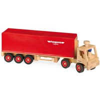 Fagus Sattelschlepper - ein wahrgewordener Kindertraum Dieses Holzspielzeug von Fagus sucht seines Gleichen. Hochqualitativer Sattelschlepper aus heimischem Buchenholz (aus nachhaltig bewirtschafteten Wäldern), aufwendig verzahnt und gedübelt. Lenkbar, Führerhaus entkoppelbar, Plane abnehmbar, von der Seite oder von hinten zu be- und entladen. Mit Europalette, 2 Püppchen, Kautschuk Reifen und vielen weiteren Details. Streng schadstoffgeprüft, lösungsmittelfrei lackiert. Für Kinder ab 1 Jahr. Ausgezeichnet mit dem spiel gut Siegel.   Sattelschlepper zum Spielen aus massivem Buchenholz, lackiert (lösungsmittelfrei) Länge 65,5 cm Zahlreiche Details wie abnehmbare Plane, klappbare Bracken und vieles mehr Absolut hochwertig in Deutschland hergestellt, ausgezeichnet mit dem spiel gut Siegel Mit 2 Holz-Männchen und Europalette