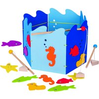 Das Angelspiel – bei Jungen und Mädchen gleichermaßen beliebt Das über Generationen bewährte wie beliebte Angelspiel gehört zu den Klassikern der Kinderspiele und kommt nie aus der Mode. Kinder ab drei Jahren haben Freude an dem Angelspiel aus Holz und Erlernen erste Spielregeln. Beinhaltet einen See, 3 Angeln mit Magneten und 15 Meeresbewohner. Das Spiel wurde aus Holz gefertigt, solide und hochwertig verarbeitet. Maß des See: Durchmesser ca. 40 cm. Der Kinderspiel Klassiker in der Holzvariante goki Spielzeug mit 3 Angeln, See und 15 Meeresbewohnern Schult die Geschicklichkeit und Motorik Erstes Erlernen einfacher Spielregeln Holzspielzeug für Kinder ab 3 Jahren Vorbereitung, Regeln, Ziel Kleine Kinder sind begeistert, wenn sie gemeinsam mit Eltern oder Geschwisterkind die ersten Kinderspiele nach Regeln spielen dürfen. Der hübsch lasierte, dunkelblaue See hat einen Durchmesser von ca. 40 cm. Der Holzsee wird auf dem Boden oder Tisch aufgestellt, die Enden mit einem Faden verschlossen. Nun werden noch Fische, Seesterne und der alte Schuh, der bei einem Angelspiel nicht fehlen darf, in die Tiefe des Sees gegeben. Ist dies erledigt, angeln zwei bis drei Spieler abwechselnd aus dem See. Jedes Meerestier ist unterschiedlich viele Punkte wert. Die Angelrute des goki Spielzeuges ist mit einem Magnet versehen. An der potenziellen Beute wurde ebenfalls ein Magnet angebracht. Nun gilt es beim Angelspiel mit möglichst viel Geschick einen Fang an Land zu ziehen. Ist der komplette See „leer geangelt“, werden die Punkte jeden einzelnen Spielers zusammengezählt. Sieger ist der Spieler mit der höchsten Punktzahl. Holzspielzeug ist etwas Besonderes Schon das Aufbauen des Angelspieles bereitet Freude. Die Holz-Angeln liegen gut in der Hand, die Fische, Seesterne und der alte Stiefel wurden bunt lasiert, so dass die Maserung des Holzes durchschimmert. Selbstverständlich ist ein Angelspiel aus Holz wesentlich robuster, als herkömmliches Angelspiele aus Karton. Das goki Kinderspiel aus Holz ist robust, hier dürfen kleine Hände auch mal beherzter zugreifen, ohne dass ein Meeresbewohner darunter leidet. Die verwendeten Lasuren sind allesamt lösungsmittelfrei, gesundheitlich unbedenklich und erfüllen die EU Norm EN 71. Details zum Produkt Stabiler Stand auf Boden bzw. Tisch Optimale Spieldauer für kleinere Kinder Durchmessers des Sees: 40 cm Achtung! Wegen ablösbarer, verschluckbarer Kleinteile und damit verbundener Erstickungsgefahr. Nicht geeignet für Kinder unter 3 Jahren.