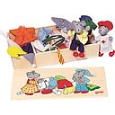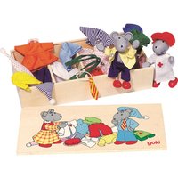 Biegepuppen und passende Puppenkleidung Was für eine tolle Spielidee! Die goki Biegepuppen aus Holz werden mit einer Holzkiste geliefert, prall gefüllt mit passender Kleidung. Kinder ab 3 Jahren haben die Qual der Wahl, welches der 8 Kleidungssets, den kleinen Mäuse Biegepuppen angezogen werden.Vom gepunkteten Nachthemd mit passender Schlafmütze, übereinen Arztkittel bis hin zur Arbeitsschürze für den Gärtner ist alles vorhanden, damit Maus und Mäuserich passend angezogen sind.Mit dem Set aus Biegepuppen und Puppenkleidung können Kinder frei und kreativ spielen, sich Geschichten ausdenken und schulen beim An- und Auskleiden ihre Feinmotorik. Nach dem Spielen werden die Puppen und die Puppenkleidungin der hübschen Holzkiste verstaut. Geschlossen wir die praktische Kiste mit einem Deckel, auf dem die beiden Mäuse zu sehen sind. Für Kinder ab 3 Jahre, streng schadstoffgeprüft. 2 Mäuse Biegepuppen aus Holz, bunt lackiert (lösungsmittelfrei)und 8 Bekleidungssets Mit praktischer Box aus Schichtholz, klar und bunt lackiert (lösungsmittelfrei) Regt die Phantasie an, schult die Feinmotorik und ermöglicht tolle Rollenspiele Maße Mäuse 11 x 4 cm Puppen mit stabilem Stand/Sitz Warnhinweis Achtung! Nicht geeignet für Kinder unter 3 Jahre. Erstickungsgefahr.
