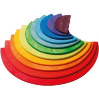 Holzspielzeug wie es sein soll Kinder schätzen Holzspielzeug. Spielen mit Spielzeug aus Holz ist Spielen mit allen Sinnen. Sind die Produkte dann noch so hochwertig verarbeitet, pädagogisch wertvoll gestaltet und kindgerecht gemacht wie die Regenbogen Halbkreise von Grimms, haben Kinder Spielzeug zur Hand, zu dem sie immer wieder gerne greifen. Die harmonische Farben und klarenFormen der Halbkreiselassen den Kleinen Raum, um sich frei und kreativentfalten zu können. Spiel gut zertifiziert. Grimms Holzspielzeug fördert Feinmotorik, Konzentration und Farbempfinden Maße 37 x 18,5 x 9 cm 11-teiliges Stapel- und Legespiel AusLindenholz, bunt lasiert Kombinierbar mit allen Holzbausteinen und Regenbögen der Firma Grimms Legen, Stapeln, Bauen Montessori Bausteinevon Grimms sind stets so konzipiert, dass kleine und große Kinder sich ausprobieren können. Ein gelungenes Beispiel sind dieLegespiel Halbkreise von Grimms. Schon Kinder ab einem Jahr können mit den Halbkreisen spielen. Die harmonische Farbgebung, die durch die Lasur schimmernde, lebendige Maserung und die unverwechselbare Haptik des Holzes spornen Kinder an, sich auszuprobieren und zu entdecken. Mit den Halbkreisen können auf dem Boden Bauwerke, Muster und Reihen entstehen. Ganz nebenbei wird das Farbempfinden geschult und die Feinmotorik gefördert. Die einfachen, klaren Formen und satten Farben laden Jungen und Mädchen dazu ein, immer wieder damit zu spielen und zu bauen. Grimms Regenbogen, Halbkreise, Schälchensätze – alles kombinierbar Mit den Halbkreisen von Grimms haben Kinder unendlich viele Möglichkeiten zu spielen. In unserem Shop finden Sie diverse Produkte von Grimms Holzspielzeug, die sich fabelhaft mit den Holz Halbkreisen ergänzen. So können gemeinsam aus dem Grimms Regenbogen, Schälchensätzen und den Halbkreisen Puppenhäuser mit mehreren Etagen oder andere beeindruckende Bauwerke entstehen. Der Phanatsie sind keine Grenzen gesetzt und genau das ist das oberste Anliegen Grimms: freies, kreatives Spielen, nach Montessori, das der Phantasie freien Lauf lässtund fordert, aber nicht überfordert. Details zum Produkt Nach EN 71 zertifiziert (Sicherheit für Spielzeug) Durscheinende Maserung Speichelfeste Wasserfarben, gesundheitlich unbedenklich Warnhinweis Achtung! Nicht geeignet für Kinder unter einem Jahr. Verletzungsgefahr.