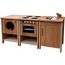 Kleine Küche mit großem Spielspaß Sicher, Spielzeuge gibt es mittlerweile in den verschiedensten Größen, Formen und Varianten. Sowohl für kleine als auch große Kinder. Doch nur wenige Spielzeuge lassen sich als hochwertig, geschweige denn pädagogisch wertvoll bezeichnen. Diese Spielküche aus Holz darf allerdings durchaus als ein solches Produkt angesehen werden. Gerade im Zeitalter der diversen Smartphones, Tablets und sonstigen technischen Errungenschaften hat eine Kinderküche aus Holz gleich in vielerlei Hinsicht viele positive Eigenschaften zu bieten, mit denen die diversen Konkurrenzprodukte der Spielebranche nicht Schritt halten können! Freies, kreatives Spielen, sich ausprobieren, Neues entdecken - all das ist mit dieser Spielküche aus Holz möglich. Zudem ist die Kinderküche aus Holz gefertigt, ein sicheres, natürlichesSpielen nach Montessorimit allen Sinnen, ist also garantiert. Funktionen und Möglichkeiten Waschen, Kochen, Putzen, Backen – dies und noch viel, viel mehr darf, spielerisch betrachtet, mit einer Holzküche erledigt werden. Ausgestattet mit diversen Schubladen und einem eingelassenen Kühlschrank steht dieses Einrichtungsstück im Kleinstformat der „richtigen“ Küche im Grunde genommen schließlich in nichts nach. Lediglich die Anschlüsse für Wasserhahn und Spülmaschine, Gasleitung und Elektroherd fehlen bei der Spielküche, verständlicherweise. Das tut dem Spielspaß allerdings keinen Abbruch. Ganz im Gegenteil! Denn der, beziehungsweise die Spieler, dürfen somit auch ohne Aufsicht in ihrer kleinen Kochnische in Aktion treten.Und: Ausgestattet mit zahlreichen Extras wie Eierfach und Schüsselset bringt eine Spielküche auch stets das passende Küchenequipment mit sich, welches das Werkeln auf der spielerischen Plattform noch einmal wesentlich anspruchsvoller macht. Details zum Produkt Maße je Küchenteil:Breite 35 cm,Tiefe 35 cm, Höhe 50 cm Drehbare Waschtrommel 4 Kochplatten Drehbare Regelknöpfe Aufklappbarer Backofen mit Backblech Praktisches Ablagefach Kühlschrank mit Eierfach Edelstahlschüssel in der Spüle Tür und Platte aus massivem Erlenholz, Seitenteile aus Schichtholz