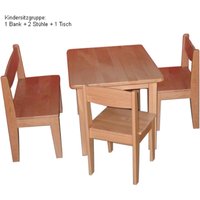 4-teilige Kindersitzgruppe aus massivem Buchenholz Kinder brauchen Platz zum Spielen. Die Kindersitzgruppe aus massivem, geöltem Buchenholz bietet den Kleinen komfortable Sitzmöglichkeiten und einen Ort zum Spielen, Basteln und Malen. Die Kinder Sitzgruppe, bestehend aus einem Kindertisch, einer Kinderbank und zwei Kinderstühlen, wurde hochwertig verarbeitet und in Deutschland in Handarbeit gefertigt. Aus massivem Buchenholz, geölt (Leinöl), Holz aus heimischen, nachhaltig bewirtschafteten Wäldern 4-teilig, 2 Stühle, 1 Tisch und 1 Bank Handgefertigt Made in Germany Spielmöbel - solide und hochwertig verarbeitet Setz dich doch Die Kindersitzgruppe aus massivem Buchenholz bietet Kindern die Möglichkeit, alleine oder mit Freunden am Kindertisch Platz zu nehmen, um dort zu malen, zu basteln oder eine kleine Zwischenmalzeit zu sich zu nehmen. Mädchen und Jungen sind begeistert, wenn sie endlich Möbel ihr Eigen nennen, die dank kindgerechter Maße ganz auf sie zugeschnitten sind. Ganz automatisch nehmen die Kleinen eine gute Haltung ein, denn hier passen die Möbelmaße zum kindlichen Körper. Die Kinderbank, der Kindertisch und die Kinderstühle stehen der Sitzgruppe der Eltern in nichts nach und sind ebenso hochwertig verarbeitet. Kinder schätzen die angenehme Haptik und Optik der Kindermöbel. Dank robuster und solider Fertigung hält die Kindersitzgruppe aus massivem Buchenholz einiges aus und steht stabil und sicher. Handgefertigte Kindermöbel „Made in Germany“ Jedes Möbelstück ist ein Unikat für sich. Dies liegt an der liebevollen Herstellung der schönen und vor allem hochwertigen Kindermöbel in reiner Handarbeit. Die Ecken und Kanten sind sorgsam und kindgerecht abgerundet – ganz so wie es sich für gutes Kinderspielzeug gehört. Die Herstellung von Sitzgruppe, Kindertisch und Co. erfolgt in Deutschland. Hinter den schönen Massivholzmöbeln steckt eine Werkstatt für körperlich und geistig benachteiligte Menschen, deren Hauptaufgabe es ist Menschen mit Behinderungen zu fördern und in den Arbeitsalltag zu integrieren. Aus diesem Grunde ist die Fertigung der Möbelstücke in keiner Weise mit einer industriellen Fertigung zu vergleichen. Die Herstellung erfolgt immer unter Berücksichtigung der individuellen Leistungsfähigkeit des jeweiligen Mitarbeiters. Aufgrund dieser Tatsache kann es in seltenen Fällen zu längeren Lieferzeiten kommen. Details zum Produkt Angenehme Haptik und natürliche Optik Abgerundete Ecken und Kanten Stabil und langlebig Ermöglicht Kindern beim Spielen eine ergonomische Haltung Maße Stuhl (H/B/T) 60 x 34 x 34 cm, Sitzhöhe ca. 32 cm Maße Tisch (H/B/L)53 x60 x 80 cm Maße Bank (H/B/T) 60 x 75 x 34 cm, Sitzhöhe ca. 32 cm Hinweis Die Kindermöbel können auch einzeln bestellt werden. Hier finden Sie den Kindertisch, den Kinderstuhl und die Kinderbank.