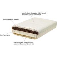 Komfortable Wendematratze aus Naturfasern für Kleinkinder Mit ihren Maßen von 70 x 140cm und einer Kernhöhe von ca. 8cm passt diese hochwertige Baby- und Kindermatratze aus dem Hause Lonsberg in viele handelsübliche Kinderbetten. Der Matratzenkern setzt sich jeweils zur Hälfte aus latexierten Kokosfasern sowie Naturlatex zusammen. Ein abnehmbarer Bezug aus 100% Lyocell umrundet die Babymatratze. Optimal für Babys und Kinder bis zum 4. Lebensjahr. Maße 70 x 140 cm, Höhe 8cm 2-teiliger Kern aus latexierten Kokosfasern und Naturkautschuk Wendematratze mit 2 Härtegraden (mittelfest/mittelweich) Vliesauflage aus einem Baumwoll-/Lyocell-Mix, abnehmbarer Bezug aus 100% Lyocell Für Babys und Kinder bis zum 4. Lebensjahr, max. 45kg Eine Matratze für die ersten 4 Lebensjahre Bei der Wahl der richtigen Matratze für Ihren kleinen Erdenbürgen tun sich viele Eltern schwer. Möchte man doch nichts verkehrt machen und dem kleinen Menschen einen guten Start in das Leben ermöglichen. Gerade in den ersten Lebensjahren sollten Kinder relativ fest schlafen. Dies mag für viele Eltern befremdlich klingen, ist jedoch logisch, wenn man sich die Anatomie der Wirbelsäule von Babys und Kindern einmal vor Augen führt. Die Wirbelsäule Ihres Babys besitzt nach der Geburt noch nicht ihre typische Doppel-S-Form, sondern ist zunächst gestreckt. Dies ist auch gut so, weil hierdurch optimale Voraussetzungen für langes Liegen und lange Schlafphasen gegeben sind. Darauf ergibt sich die von Orthopäden aufgestellte Schlussfolgerung, dass Babys und Kleinkinder auf relativ festen Babymatratzen und Kindermatratzen optimal gebettet sind. Die Wirbelsäule der Kleinen wird so optimal gestützt und entlastet. Ein Matratzenkern – zwei Materialien mit tollen Eigenschaften Der Kern dieser Baby- und Kindermatratze setzt sich aus zwei unterschiedlichen Naturfasern zusammen. Das Ergebnis ist eine wunderbare Wendematratze, die Ihnen die Wahl zwischen zwei unterschiedlichen Härtegraden bietet. Die mittelfeste Seite aus dem 3cm dicken Kern aus latexierten Kokosfasern bietet optimalen Schlafkomfort für die ganz Kleinen, während die andere aus 3cm Naturlatex bestehende Seite einen mittelweichen Schlafkomfort für etwas ältere Kleinkinder bietet. Aus Erfahrung wissen wir, dass viele Eltern die weichere Seite auch gern vorübergehend bei kränkelnden Kindern bevorzugen. Optimal durchdacht für ein angenehmes Schlafklima Das Schlafklima ist für die Schlafqualität genauso entscheidend wie die Wahl der richtigen Matratzenhärte. Aus diesem Grunde besitzt diese Kindermatratze von Lonsberg eine ca. 1cm dicke Auflage, die aus einem Baumwoll-/Lyocell Vlies besteht. Dieses wunderbare Naturmaterial besitzt einzigartige Eigenschaften, die dem Schlafkomfort zugute kommen. Lyocell ist eine relativ neue Cellulosefaser, die umweltschonend auf Pflanzenfasern hergestellt wird. Naturbettwaren aus Lyocell eignen sich hervorragend für Allergiker. Das hautfreundliche Material kann Feuchtigkeit noch besser aufnehmen und wieder abgeben als Baumwolle und sorgt somit für ein optimales Schlafklima. Ein abnehmbarer Bezug aus 100% Lyocell rundet die Matratze ab. Dieser lässt sich problemlos bei 60°C in der Waschmaschine reinigen. Der Matratzenkern samt Schurwoll-Auflage wurde zum Schutz mit einem zusätzlichen Bezug (Nessel) aus reiner Bio-Baumwolle (kbA) versehen. Hinweis: Bitte beachten Sie, dass diese Matratze speziell für Sie neu angefertigt wird. Rechnen Sie daher mit einer Lieferzeit von 2 – 3 Wochen. Wir können gegen einen Aufpreis eine kleinere Größe für Sie anfertigen lassen. Es besteht auch die Möglichkeit anstelle der Schurwollauflage eine Auflage aus Baumwolle zu integrieren. Auch eine Kombination von Schurwolle und Baumwolle ist möglich. Details zum Produkt Lyocell kann besser Feuchtigkeit aufnehmen & abgeben als Baumwolle Abnehmbarer, waschbarer Bezug aus 100% Lyocell Für Babys und Kinder bis ca. 45kg Atmungsaktiv, widerstandsfähig und langlebig Kokoskern: mittelfester Härtegrad Naturlatexkern: mittelweicher Härtegrad Stück für Stück handwerklich gefertigt QUL-zertifiziert Waschbar bei 60°C Lyocell ist besonders gut für Allergiker geeignet