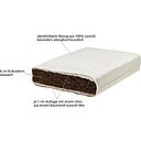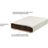 Komfortable Kindermatratze für optimalen Schlaf Hochwertige Naturmatratze für Babys und Kleinkinder aus dem Hause Lonsberg. Der mittelfeste Kern der Matratze aus latexierten Kokosfasern bietet optimalen Schlafkomfort für Kinder zwischen 0 und 4 Jahren. Die Matratzenhöhe beträgt ca. 8cm. Der 6cm hohe Kokoskern ist mit einer 1cm Kernummantelung mit einem Vlies aus einem Baumwoll-/Lyocell-Mix. Diese sorgt für ein angenehmes und stets wohltemperiertes Schafklima. Ein abnehmbarer und waschbarer Bezug aus 100% Lyocell rundet die Kindermatratze ab und macht sie besonders für Allergiker zu einer wunderbaren Schlafunterlage. Maße Matratze 70x140cm. Maße Matratze 70x140 cm, Höhe 8cm Matratzenkern aus latexierten Kokosfasern Mittelfester Schlafkomfort Auflage aus einem Baumwoll-/Lyocell-Mix, abnehmbarer, waschbarer Bezug aus 100% Lyocell Für Babys und Kinder bis zum 4. Lebensjahr, max. 45 kg Babys und Kleinkinder schlafen besser fest Die zunächst gestreckte Wirbelsäule von Babys ist optimal an die langen Liege- und Schlafphasen des Babys angepasst. Aus diesem Grunde sollten aus orthopädischer Sicht gerade die kleinsten Erdenbürger auf relativ festen Matratzen gebettet werden. Unsere Naturmatratzen mit dem mittelfesten Kern aus latexierten Kokosfasern bieten optimalen Schlafkomfort für Kinder zwischen 0 und 4 Jahren. Der Kern aus festen Kokosfasern besitzt eine Kernummantelung, die sich aus einem allergikerfreundlichen Mix aus Baumwolle und Lyocell zusammensetzt.. Diese sorgt für einen angenehmen Liegekomfort und trägt gleichzeitig zu einem optimalen Schlafklima bei. Der Matratzenkern samt Kernummantelung ist zum Schutz mit einem zusätzlichen Bezug (Nessel) aus reiner Bio-Baumwolle (kbA) versehen. Umrundet wird die Baby- und Kindermatratze mit einem abnehmbaren sowie waschbaren Bezug aus 100% Lyocell. Natürlich Schlafen auf Kokosfasern Kokosfasern sind nahezu prädestiniert um sie zu kindgerechten Matratzenkernen zu verarbeiten. Das latexierte Polstermaterial erweist sich als relativ fest, dauerhaft elastisch sowie formbeständig. Die beinahe unverwüstliche Kokosfaser ist zudem unempfindlich gegenüber Feuchtigkeit, atmungsaktiv sowie in der Lage Wärme zu speichern. Wie immer findet die Perfektion ihren Ursprung in der Natur. Um die reife Kokosnuss beim Sturz aus bis zu 30m Höhe zu schützen, bedarf es einer besonders elastischen Faser. In einem aufwändigen Prozess werden die Fasern vom Fruchtkern getrennt und schlussendlich an der Sonne schonend getrocknet. Die wunderbar leichten Kokosfasern verdanken ihre elastischen und Wärme speichernden Eigenschaften ihrem hohen Luftanteil. Vulkanisiert mit reinem Naturlatex entsteht ein dauerhaft elastischer Matratzenkern, der sich optimal für die Herstellung von Baby- und Kindermatratzen eignet. Eine Kindermatratze zum Wohlfühlen Durch die Latexierung der Kokosfasern erhält der Matratzenkern zusätzliche Elastizität, wodurch die Matratze als solches biegsam wird. Kennzeichnend für Kokosmatratzen ist die für sie typische Flächenelastizität. So geben die Matratzen bei Druckeinwirkung großflächig (flächenartig) nach, anstatt punktuell (punktelastisch) zu sein. Daraus resultiert der für Babys und Kleinkinder optimale feste und kompakte Liegekomfort. Lyocell – Allergikerfreundlich, aus Pflanzenfasern hergestellt Hinter der Faserbezeichnung Lyocell verbirgt sich eine allergikerfreundliche Cellulosefaser, die umweltschonend aus Pflanzenfasern hergestellt wird. Das robuste und noch relativ neue Material ist in der Lage Feuchtigkeit noch besser aufzunehmen und wieder abzugeben, als beispielsweise Baumwolle es kann. Dank der pflegeleichten Eigenschaften eignet sich Lyocell optimal für den Einsatz im Baby- und Kindbereich. Hinweis: Bitte beachten Sie, dass diese Lonsberg Matratze speziell für Sie neu angefertigt wird. Rechnen Sie daher mit einer Lieferzeit von 2 – 3 Wochen. Sollten Sie eine andere, kleinereals die von uns angebotene Größe (Matratze 70x140 cm) benötigen, so kontaktieren Sie uns gerne. Gegen einen Aufpreis, der sich nach Aufwand und Material berechnet, können wir jede beliebige Matratzengröße für Sie anfertigen lassen. Details zum Produkt AngevZusätzlicher Bezug (Nessel) aus Bio-Baumwolle (kbA) zum Schutz von Kern & Auflagenehme Wärme und Feuchtigkeitsregulierung durch Auflage aus einem 50:50 Baumwoll-/Lyocell-Mix Abnehmbarer Bezug aus 100% Lyocell, waschbar bis 60° Zusätzlicher Bezug (Nessel) aus Bio-Baumwolle (kbA) zum Schutz von Kern & Auflage Für Babys und Kinder bis ca. 45kg Atmungsaktiv, widerstandsfähig und langlebig Kokoskern: mittelfester Härtegrad, flächenelastisch Stück für Stück handwerklich gefertigt Zusätzliche Elastizität durch die Latexierung der Kokosfasern, Biegsamkeit QUL-zertifiziert