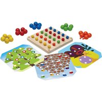 Steckspiel aus Holz für Kinder ab 3 Jahren Wunderschönes Steckspiel aus Kautschukholz mit drei Motivkarten, die jeweils auf beiden Seiten unterschiedliche Bilder zeigen. Die Karten werden auf die Holz-Steckplatte gelegt und können dann mit den 25 großen oder den 25 kleinen Steckern versehen werden. Für kleine Kinder ist es anfangs ganz schön schwierig, die Holzstecker durch den Pinzettengriff zu fassen und zu platzieren. Das Kinderspielzeug schult spielerisch die Feinmotorik, Hand-Auge Koordination und Kreativität. Teilweise bunt lackiert mit Farben auf Wasserbasis. Steckspiel aus Kautschukholz, teilweise bunt lackiert (lösungsmittelfrei) 54-teilig - 50 Stecker, 3 Karten (mit 6 Motiven), Steckplatte Für Kinder ab 3 Jahren Maße 17,5 x 17,5 x 15 cm Schult spielerisch Hand-Auge Koordination, Feinmotorik und Farbempfinden Warnhinweis Achtung! Nicht geeignet für Kinder unter 3 Jahren. Verschluckbare Kleinteile.