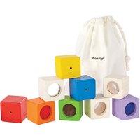 Sinnesklötze zum Entdecken und Staunen Die Holzbausteine von PlanToys sind viel mehr als Bauklötze, einige rasseln, klingeln, wurden mit einem Feld zum Fühlen versehen oder halten optische Überraschungen, wie zum Beispiel einen Spiegel oder eine Lupe, bereit. Beim Spielen mit dem Montessori Spielzeug werden ganz nebenbei die Sinne gefördert und die Motorik geschult. Bunt lackiert mit Farben auf Wasserbasis (lösungsmittelfrei). Mit praktischem Baumwollbeutel mit Zugkordel. So bleibt nach dem Spielen alles beisammen. Baby- und Kinderspielzeug aus Kautschukholz, umweltfreundlich und sozial fair hergestellt. Für Kinder ab 1 Jahr. Sinnes- und Entdeckerklötze aus Kautschukholz, bunt lackiert (lösungsmittelfrei) 10 Holzbausteine mit unterschiedlichen Funktionen, Baumwollbeutel Schult Motorik und Sinne Umweltfreundlich und sozial fair hergestellt Maße einzelner Würfel 3,5 x 3,5 x 3,5 cm Warnhinweis Achtung! Nicht geeignet für Kinder unter 1 Jahr. Verletzungsgefahr.