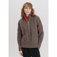 Wertvoll: Der einzigartige Strickpullover mit asymmetrischem Zopfmuster und Troyerkragen ist ist aus der ungefärbten Schurwolle vom Rhönschaf gestrickt, das Schaf mit dem schwarzen Kopf, das vor allem im Biosphärenreservat der Rhön zuhause ist.