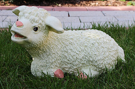 Produkt: Dekorationsfigur Lämmchen liegend - Tierfigur für Wohnbereiche und Gärten. Maße ca.: Höhe 20 cm. Material: Qualitätskunstharz - frostsicher und witterungsbeständig. Herstellung: in Doppelgußverfahren mit handwerklichem Finishing. Das Produkt wird im EU-Land angefertigt.