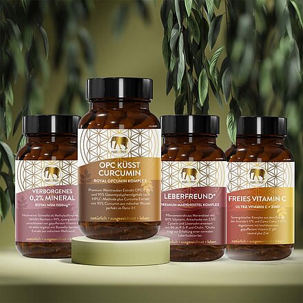Hochwertige Ayurveda Kombination aus FREIES VITAMIN C, OPC KÜSST CURCUMIN, LEBERFREUND und VERBORGENES 0,2% MINERAL Kapseln. Zusammen bilden sie eine synergistische Einheit aus Pflanzenstoffen sowie wertvollen B-Vitaminen, Zink und *Vitamin C. Selbstverständlich ohne jegliche unerwünschte Zusätze. Vegan, laktosefrei, glutenfrei. Premium Qualität durch ausgewählte Erzeuger. 4 X 60 Kapseln = 240 Kapseln für bis zu 240 Tage. Hochwertige Pflanzenstoffe , abgerundet mit wirksamen Vitaminen Dauerhafte Nahrungsergänzung für die tägliche Einnahme Wertvolle Pflanzenstoffe aus OPC, Kurkuma, Acerola, Camu Camu, Mariendistel und mehr Sinnvoll ergänzt mit Vitamin B6 als ganzheitliche Eigenschaft zur Aufrechterhaltung des inneren Gleichgewichts *Vitamin C trägt zu einer normalen Funktion des Immunsystems (körperliche Abwehr) bei Zink trägt zu einer normalen DNA-Synthese bei Pyridoxin als Vitamin B6 trägt zu einer normalen Funktion des Nervensystems bei 100% vegane Kapseln aus pflanzlicher Cellulose 100% rein- frei von unerwünschten Zusatzstoffen wie Trennmittel, Magnesiumstearat, Aromen, Farb- oder Konservierungsstoffe Nachhaltig und lichtgeschützt verpackt in Braunglas - 100% recycelbar Praktische und bequeme Einnahme (mittlere Kapselgröße zum einfachen Schlucken) Versandkostenfrei 4 Packungen a 60 Kapseln