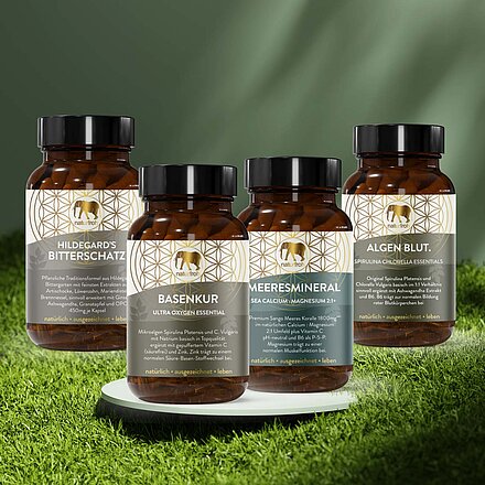 Hochwertige Säure-Basen* Kur im Vorteilspaket bestehend aus BASENKUR, ALGEN BLUT, HILDEGARDS BITTERSCHATZ und den beliebten MEERESMINERAL Kapseln. Zusammen bilden Sie eine synergistische Einheit aus Pflanzenstoffen sowie wertvollen Vitaminen und Spurenelementen. Ideal zur Fastenkur. Wie bei Naturfroh üblich: ohne jegliche unerwünschte Zusätze. Vegan, laktosefrei, glutenfrei. Premium Qualität durch ausgewählte Erzeuger. 4 X 60 Kapseln = 240 Kapseln. Hochwertige Pflanzenstoffe, abgerundet mit wirksamen Vitaminen Ideal Vor- während- oder nach- Fastenkur Als Basen Kur begleitend zum Fasten zu Hause oder dauerhafte Nahrungsergänzung für die tägliche Einnahme Wertvolle Pflanzenstoffe aus Spirulina und Chlorella Algen, Artischocke, Löwenzahn, Mariendistel, Brennnessel und mehr Sinnvoll ergänzt mit Vitamin B6 als ganzheitliche Eigenschaft zur Aufrechterhaltung des inneren Gleichgewichts *Zink trägt zu einem normalen Säure-Basen-Stoffwechsel bei Vitamin C trägt dazu bei, die Zellen vor oxidativem Stress zu schützen Magnesium hat eine Funktion bei der Zellteilung 100% vegane Kapseln aus pflanzlicher Cellulose Gefäßfreundlich und magenschonend: Gepuffertes Vitamin C (pH-neutral) 100% rein- frei von unerwünschten Zusatzstoffen wie Trennmittel, Magnesiumstearat, Aromen, Farb- oder Konservierungsstoffe Nachhaltig und lichtgeschützt verpackt in Braunglas - 100% recycelbar Praktische und bequeme Einnahme (mittlere Kapselgröße zum einfachen Schlucken) Versandkostenfrei 4 Packungen a 60 Kapseln