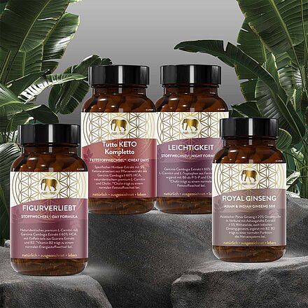 Hochwertige Stoffwechsel* Kapseln begleitend zu einer Keto Diät. Stoffwechsel Formel als Kombination aus TUTTO KETO KOMPLETTO, FIGURVERLIEBT, LEICHTIGKEIT und den beliebten ROYAL GINSENG Kapseln. Zusammen bilden sie eine synergistische Einheit aus Pflanzenstoffen aber auch wertvollen Vitaminen. Selbstverständlich ohne jegliche unerwünschte Zusätze. 4 X 60 Kapseln = 240 Kapseln. Hochwertige Pflanzenstoffe, abgerundet mit wirksamen Vitaminen Begleitend zu einer Stoffwechsel Kur bzw. Keto Diät Wertvolle Pflanzenstoffe aus Grüntee Extrakt, Himbeer Extrakt mit 5% Ketonen, Garcinia Cambogia HCA, Maca, Tribulus und mehr Sinnvoll ergänzt mit Vitamin B6 als ganzheitliche Eigenschaft zur Aufrechterhaltung des inneren Gleichgewichts *Cholin trägt zu einem normalen Fettstoffwechsel bei Vitamin B6 trägt zu einem normalen Energiestoffwechsel bei 100% vegane Kapseln aus pflanzlicher Cellulose 100% rein- frei von unerwünschten Zusatzstoffen wie Trennmittel, Magnesiumstearat, Aromen, Farb- oder Konservierungsstoffe Nachhaltig und lichtgeschützt verpackt in Braunglas - 100% recycelbar Praktische und bequeme Einnahme (mittlere Kapselgröße zum einfachen Schlucken) Versandkostenfrei 4 Packungen a 60 Kapseln
