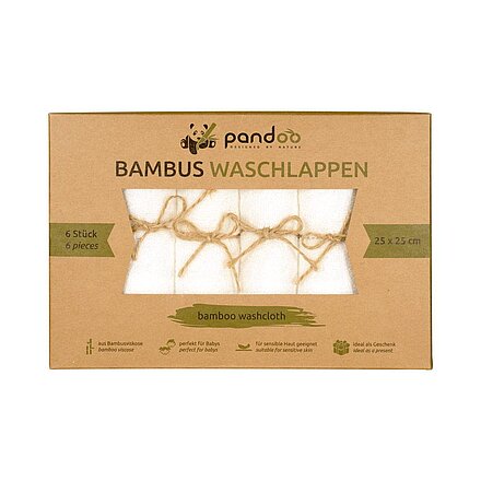 Besser als KatzenwäscheDie pandoo Waschlappen aus 100% Bambusviskose sind kuschelweich, hypoallergen und antibakteriell. Besonders geeignet für empfindliche Babyhaut. Beschreibung Stück pro Packung: 6 Waschlappen Größe: 25 x 25 cm Material: 100% Bambusviskose Entsorgung: Upcycling ist die beste Alternative, um das Leben von Stoffen und Stoffresten zu verlängern. Unsere Waschlappen können nach längerem Einsatz z.B. noch zum Putzen verwendet werden, bevor sie endgültig entsorgt werden.Die Waschlappen im Restmüll entsorgen. Verpackung: Karton mit Plastikfenster.Plastik vom Karton trennen und im Gelben Sack entsorgen. Karton im Altpapiermüll entsorgen. Produziert in: Shaanxi Provinz, China Zertifizierung: Unser Produzent ist BSCI-zertifiziert Anwendung: Ein universeller Waschlappen gehört zu jeder Baby-Grundausstattung dazu: ob als Mulltuch, Spucktuch, Badetuch oder als Waschtuch für den täglichen Einsatz!Bambus an sich hat hyperallogene, antibakterielle und anti-mikrobielle Eigenschaften und ist dadurch ideal für die empfindliche Babyhaut. Waschanleitung: Bei 30°C im Feinwaschprogramm oder Schonwaschgang waschen.Nicht für den Trockner geeignet. Impact Wiederverwendbar Waschlappen, um Abfälle zu reduzierenEine NABU-Studie von 2018 hat festgestellt, dass 2017 in Deutschland 350.000 Tonnen Abfall allein durch Einwegprodukte angefallen sind. Vermeide Einweg-Feuchttücher und verwende stattdessen wiederverwendbare Alternativen, um deinen täglichen Abfall zu reduzieren. Unsere Waschlappen können einfach in der Wäsche bei 30°C gewaschen und wiederverwendet werden. window.SHOGUN_IMAGE_ELEMENTS = window.SHOGUN_IMAGE_ELEMENTS || new Array(); window.SHOGUN_IMAGE_ELEMENTS.push({ hoverImage: '', uuid: 's-fd9ee37c-83c0-4270-8fad-ff3a528c2088' }) FAQ Wie viel kostet der Versand?Mehr über den Versand erfährst du auf unserer Hilfe Seite. Sind die Tücher kochfest?Leider nicht. Viskose soll bei maximal 40°C gewaschen werden. Wir empfehlen, die Waschlappen bei 30°C im Schonwaschgang zu waschen. Ist an den Waschlappen eine Schnur zum Aufhängen angebracht?Leider nicht, wir merken uns den Vorschlag als Verbesserungsmöglichkeit für die Zukunft! Bewertungen